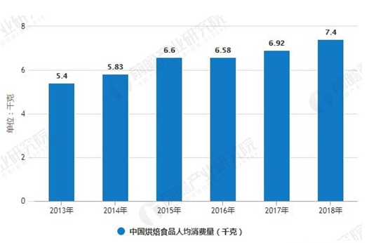 隨著飲食習(xí)慣的改變,我國烘焙食品年人均烘焙產(chǎn)品消費量逐年上升。據(jù)中國食品工業(yè)協(xié)會烘焙專業(yè)委員會統(tǒng)計數(shù)據(jù)顯示,2018年,我國烘焙食品人均消費量約7.4千克。