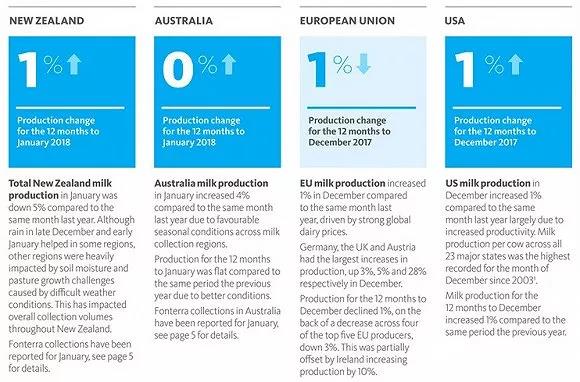 最近,恒天然(Fonterra)在其官網(wǎng)上披露了2018年2月最新財務(wù)數(shù)據(jù),公司今年1月國內(nèi)牛奶產(chǎn)量同比下降5%,原因是“糟糕的天氣狀況導(dǎo)致土壤濕度不夠,進(jìn)一步影響了牧草生長和奶牛產(chǎn)奶”。
